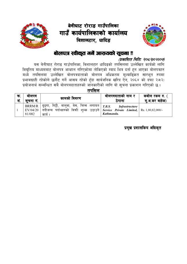 बोलपत्र स्वीकृत गर्ने आशयको सूचना । (ढुङ्गा, गिट्टी, बालुवा, वेस, चिप्स लगायत नदिजन्य पदार्थहरुको विक्री शल्क उठाउने कार्य)
