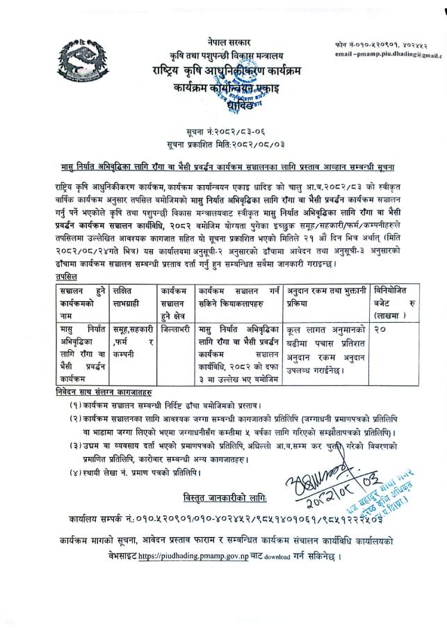 मासु निर्यात अभिवृद्धिका लागि राँगा वा भैसी प्रवर्द्धन कार्यक्रम सञ्चालनका लागि प्रस्ताव आव्हान सम्बन्धी सूचना
